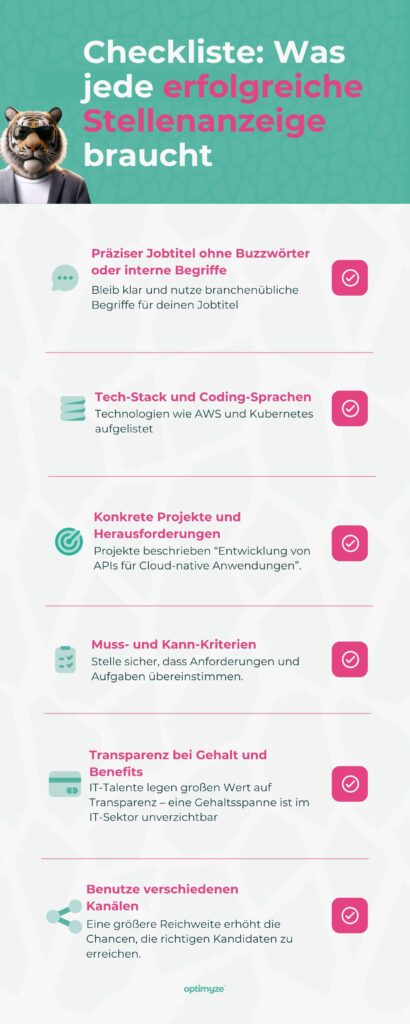 Beobachtet die Resonanz: 10 passende Bewerbungen sind besser als 100 unpassende – Qualität geht vor Quantität bei eingehenden Kandidaten. Mit einer individuellen Stellenanzeige zeigt ihr nicht nur, wen ihr suchen, sondern auch, wer ihr als Arbeitgeber sind – und genau das überzeugt die richtigen Kandidaten. Es lohnt sich also, an euren Stellenanzeigen zu feilen – in der Tech-Branche kann dies den entscheidenden Vorsprung bedeuten.